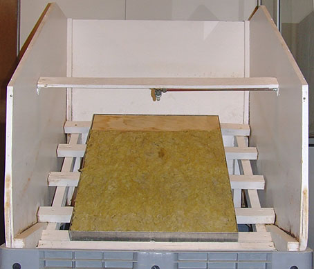 Prøvestand på Statens Byggeforskningsinstitut til måling af undertages telteffekt. Billedet viser en stråtstillet aluminiumsbakke, som øverst er fyldt med krydsfiner og nederst er fyldt med mineraluld. Ved prøvningen overtrækkes bakken med undertagsmateriale, og der sprøjtes vand på i 6 timer. Efter vandpåsprøjtningen vejes bakken, hvorved det kan konstateres, hvor meget vand der er trængt igennem undertagsmaterialet. Der må højst trænge 15 g vand igennem, hvis materialet skal have betegnelsen ”uden telteffekt”.